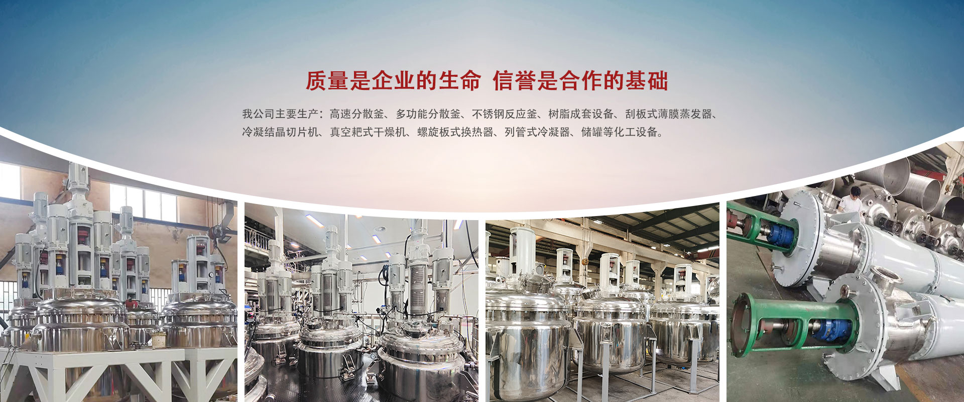 我公司主要生產:高速分散釜、多功能分散釜、不銹鋼反應釜、樹脂成套設備、刮板式薄膜蒸發(fā)器、冷凝結晶切片機、真空耙式干燥機、螺旋板式換熱器、列管式冷凝器、儲罐等化工設備。